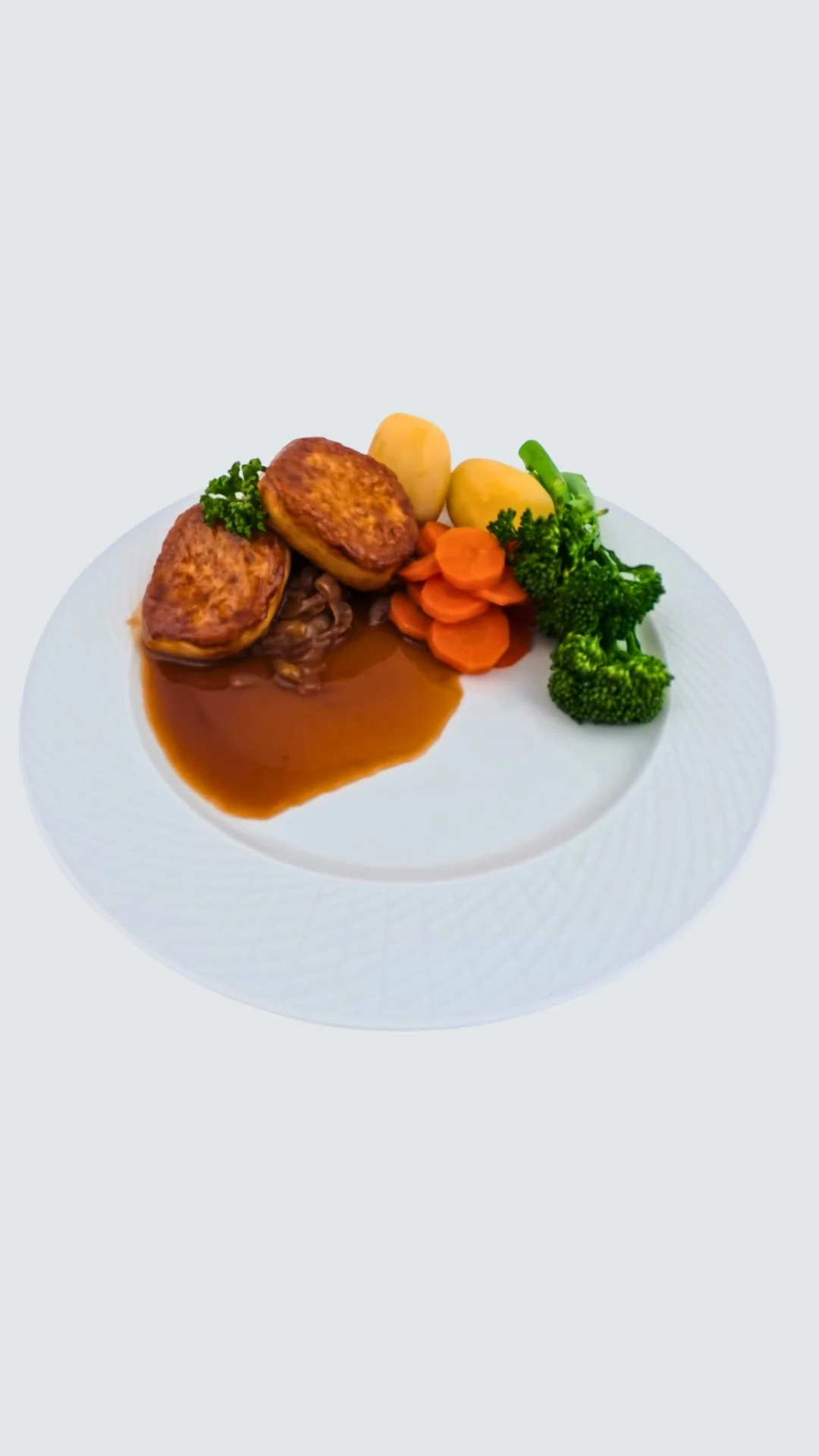Legg fiskekaker på tallerken med karamellisert løk, poteter og grønsaker. Hell brun saus over.